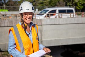 Here’s the result, featuring star-of-the-show – project engineer and lead engineer for the Bridge Superstructure, Simone Myburgh, bridge supervisor Tony Pemberton  and project manager James Weller.